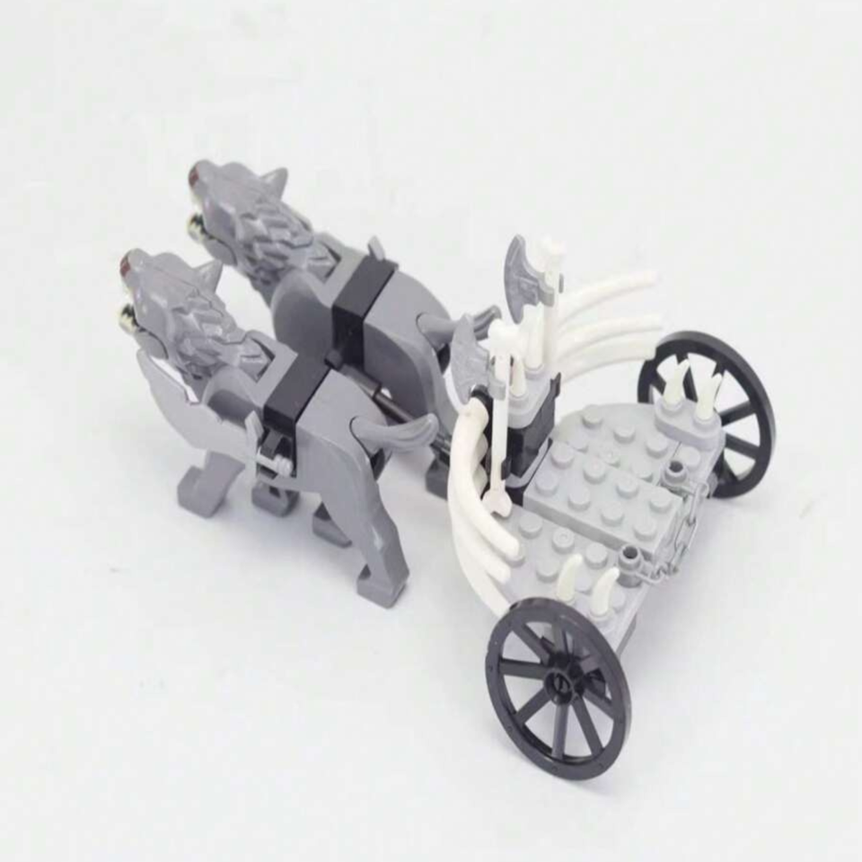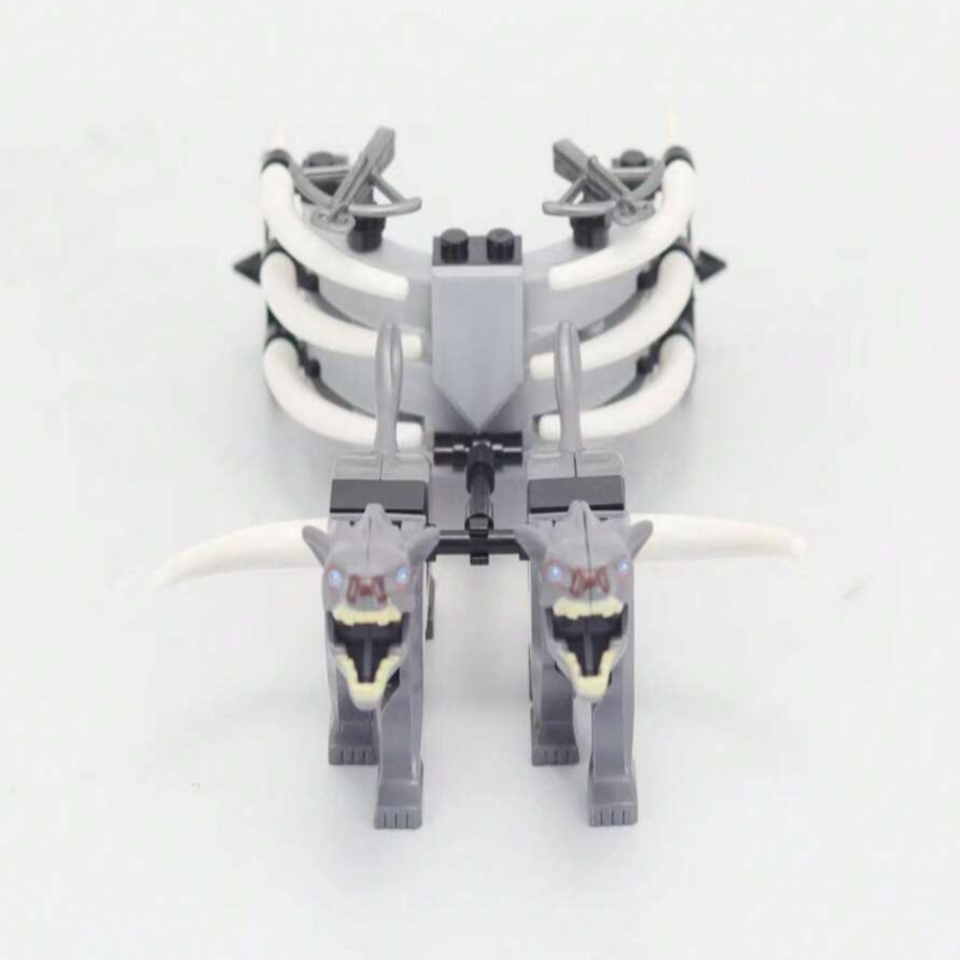 Add a feral touch to your fantasy army with this bone-armored chariot pulled by two grey war wolves. Featuring curved skeletal framing, twin axes, and spiked accents, this vehicle is ideal for barbarian raiders, dark clans, or beast-themed factions. Use it to reinforce your frontline or as a dramatic element in your custom battle scenes.