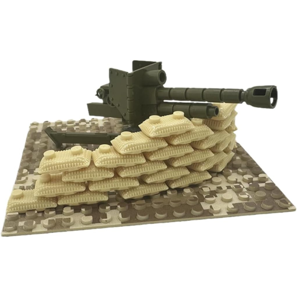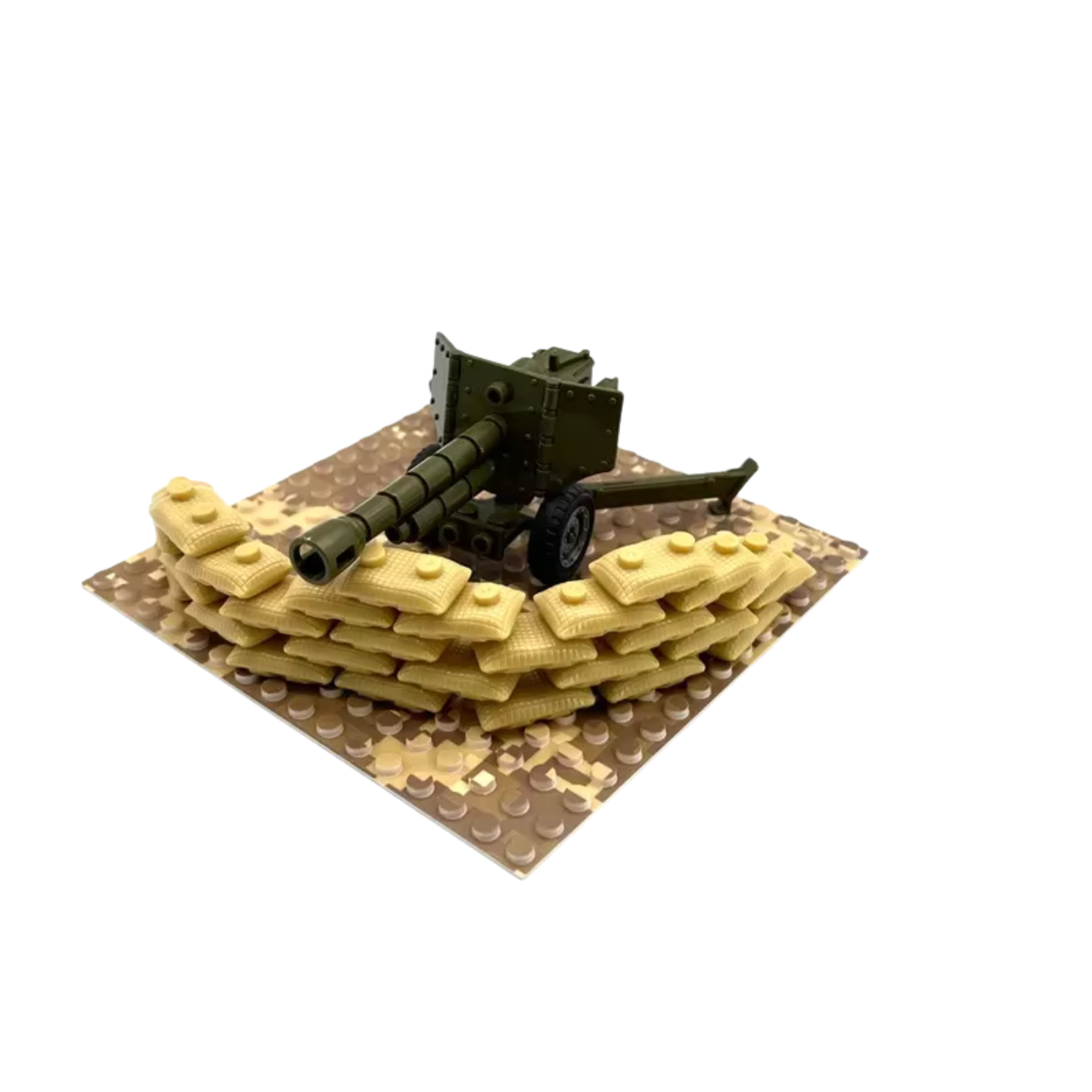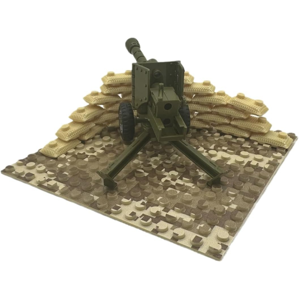 Defend your desert frontlines with this detailed artillery setup featuring a green field cannon and protective sandbag wall. The realistic camouflage baseplate and reinforced barrier make it a great addition to any military or WW2-themed diorama. Perfect for staging ambushes or reinforcing outposts in arid battle zones.