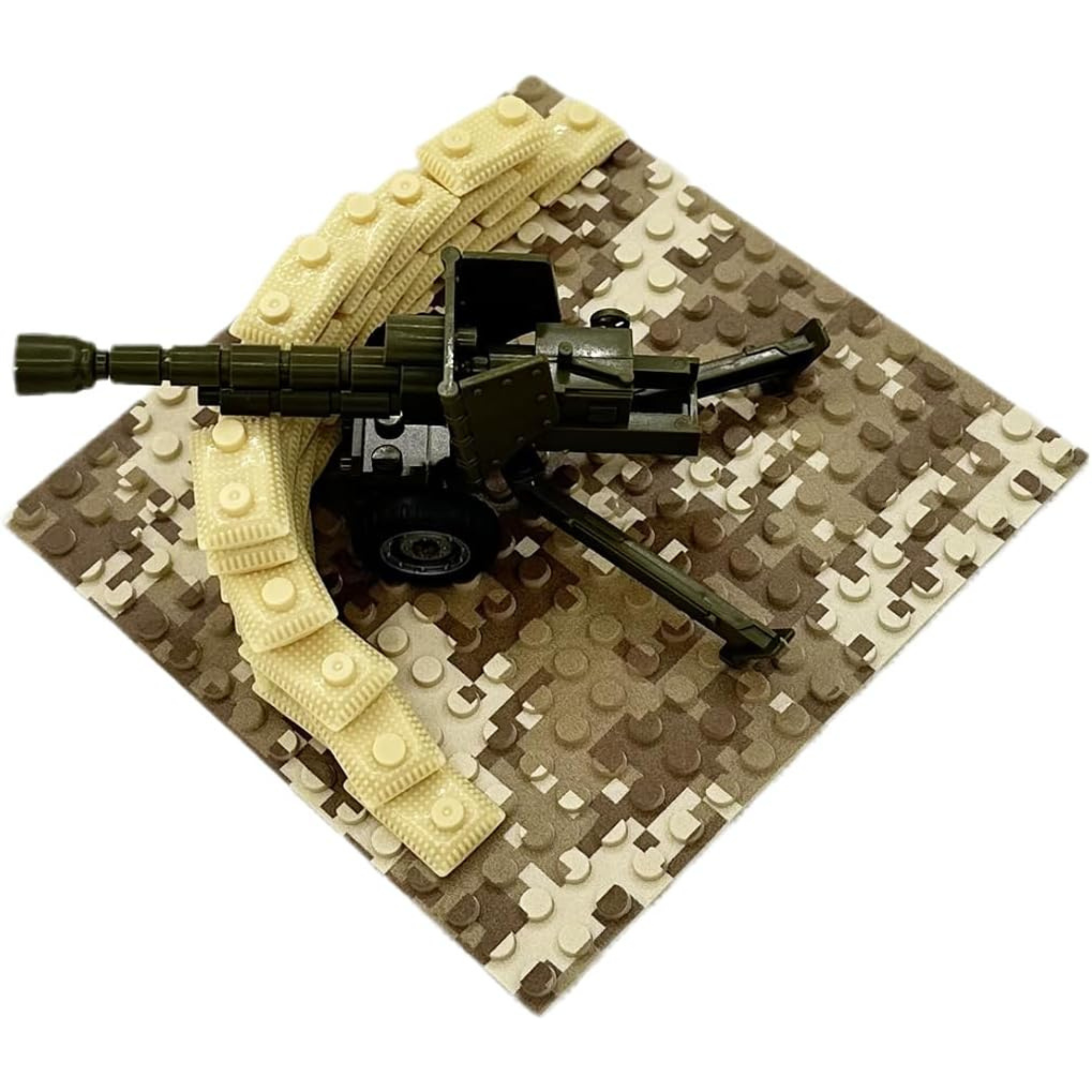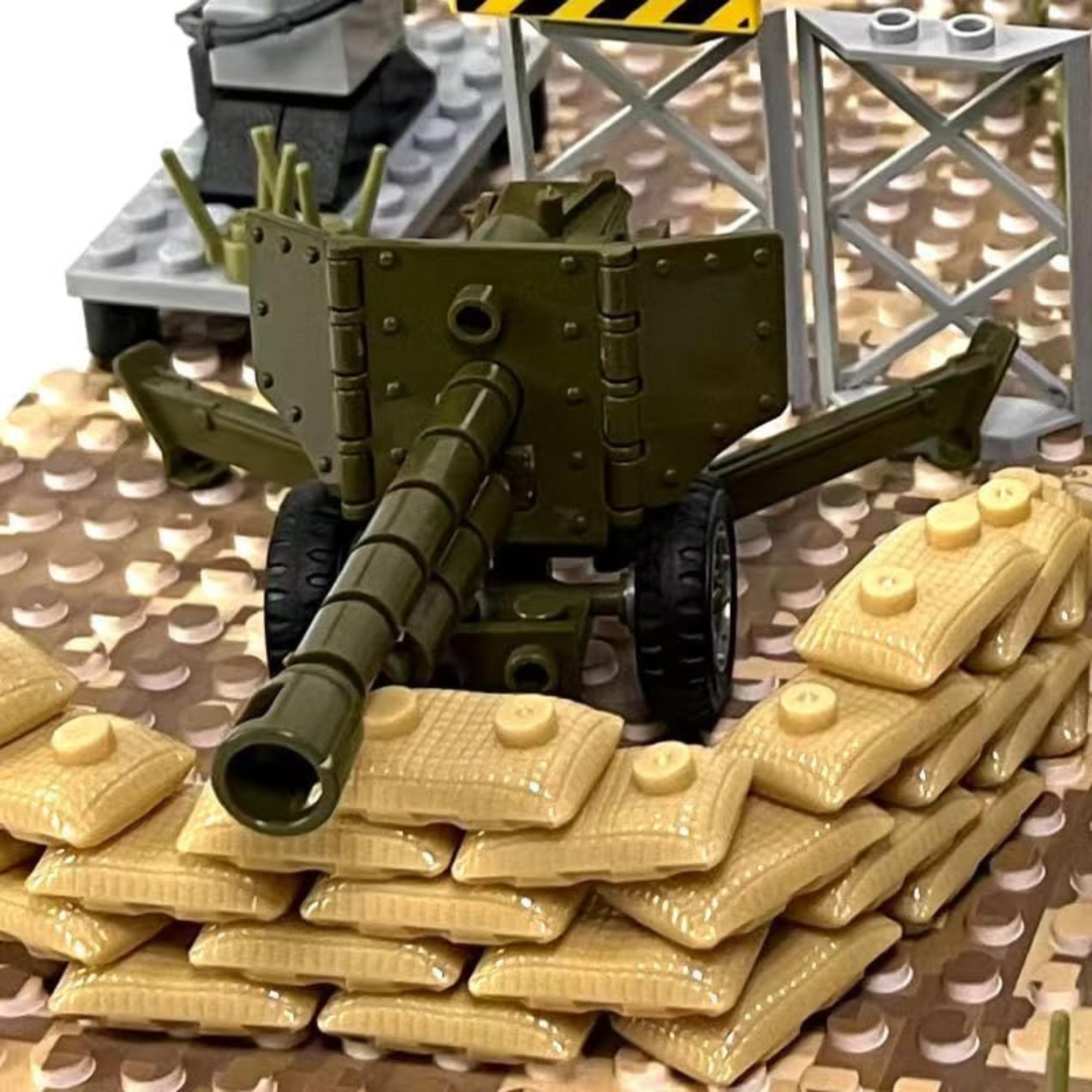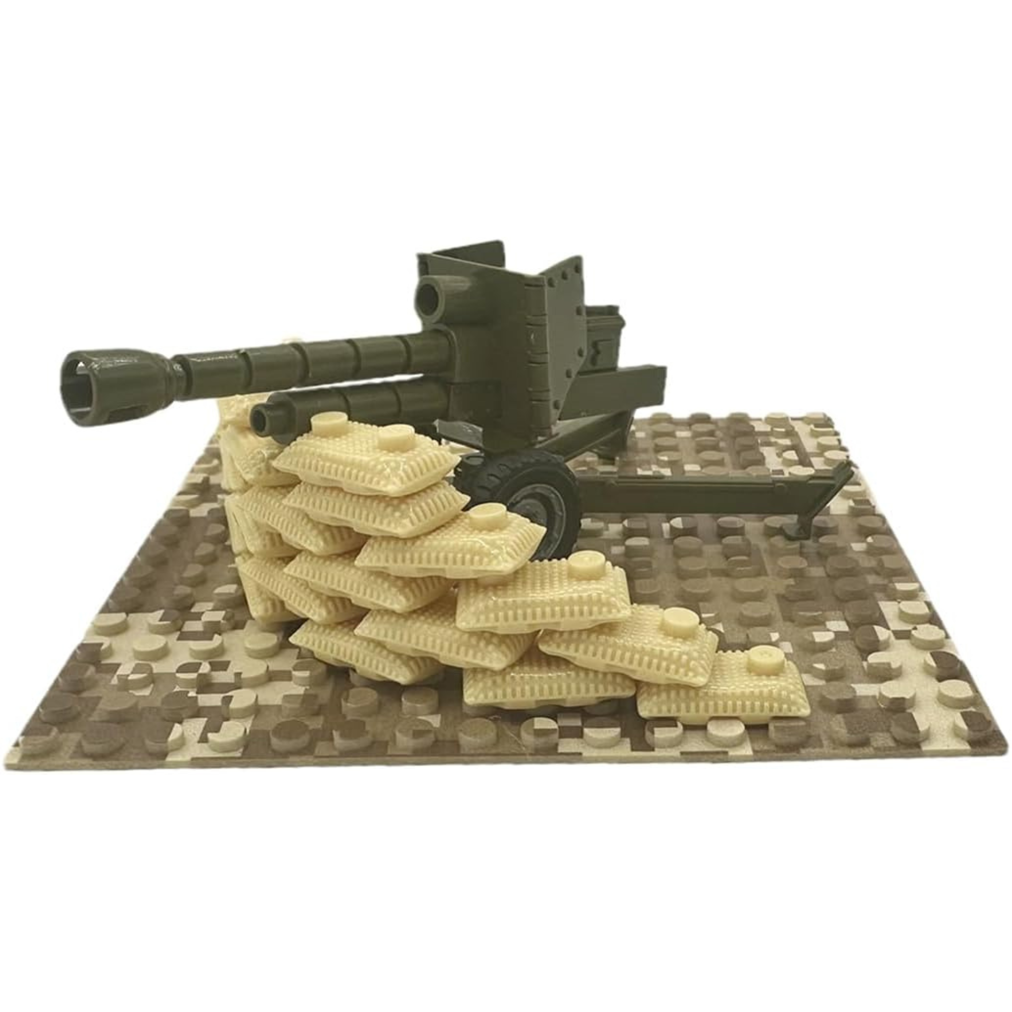Defend your desert frontlines with this detailed artillery setup featuring a green field cannon and protective sandbag wall. The realistic camouflage baseplate and reinforced barrier make it a great addition to any military or WW2-themed diorama. Perfect for staging ambushes or reinforcing outposts in arid battle zones.