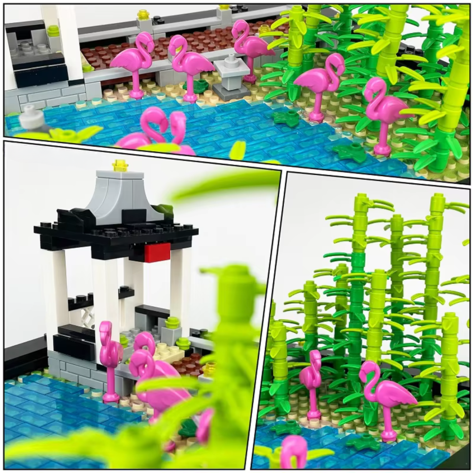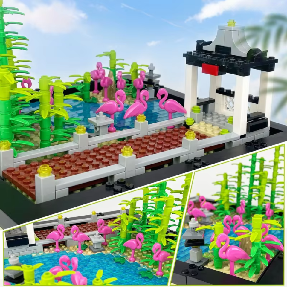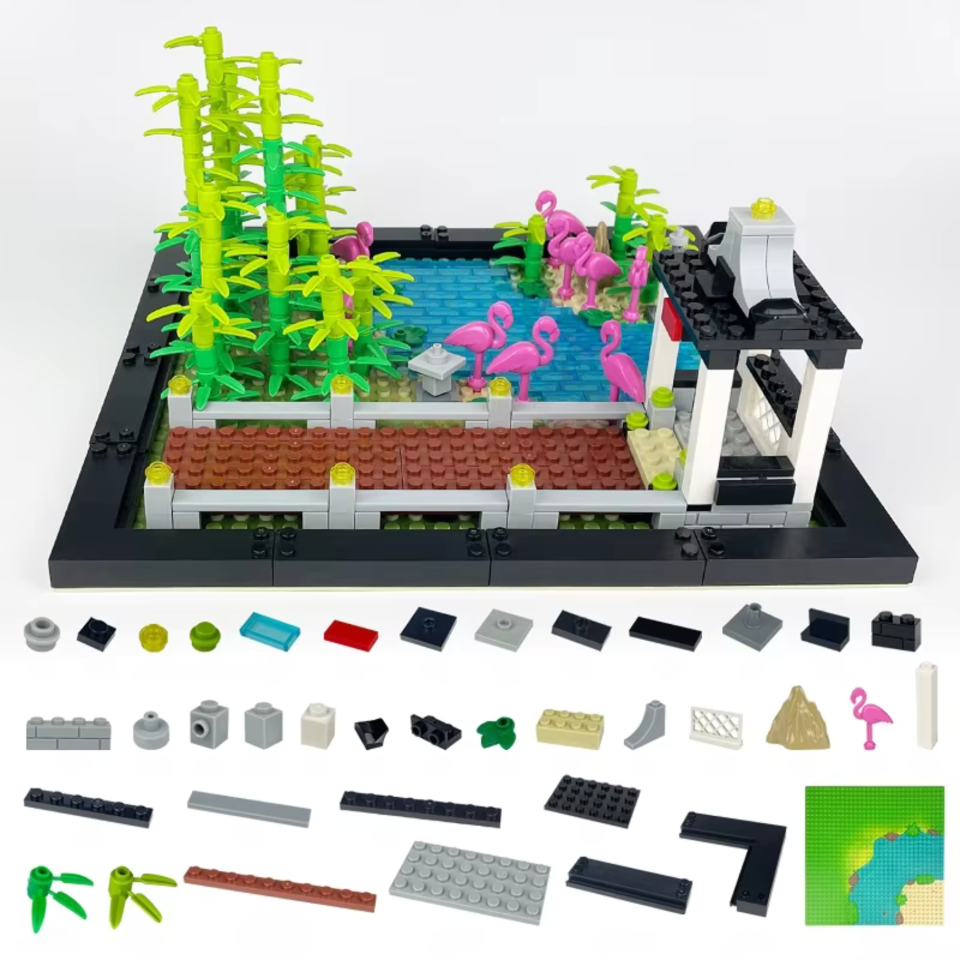 Bring a splash of color and tranquility to your display with this Flamingo Pond & Bamboo Garden building blocks set. This compact and scenic build includes a raised pavilion, a bamboo grove, a tiled walkway, and a crystal-clear pond teeming with bright pink flamingos. Perfect as a standalone display or an add-on to a larger zoo, garden, or nature-themed layout.