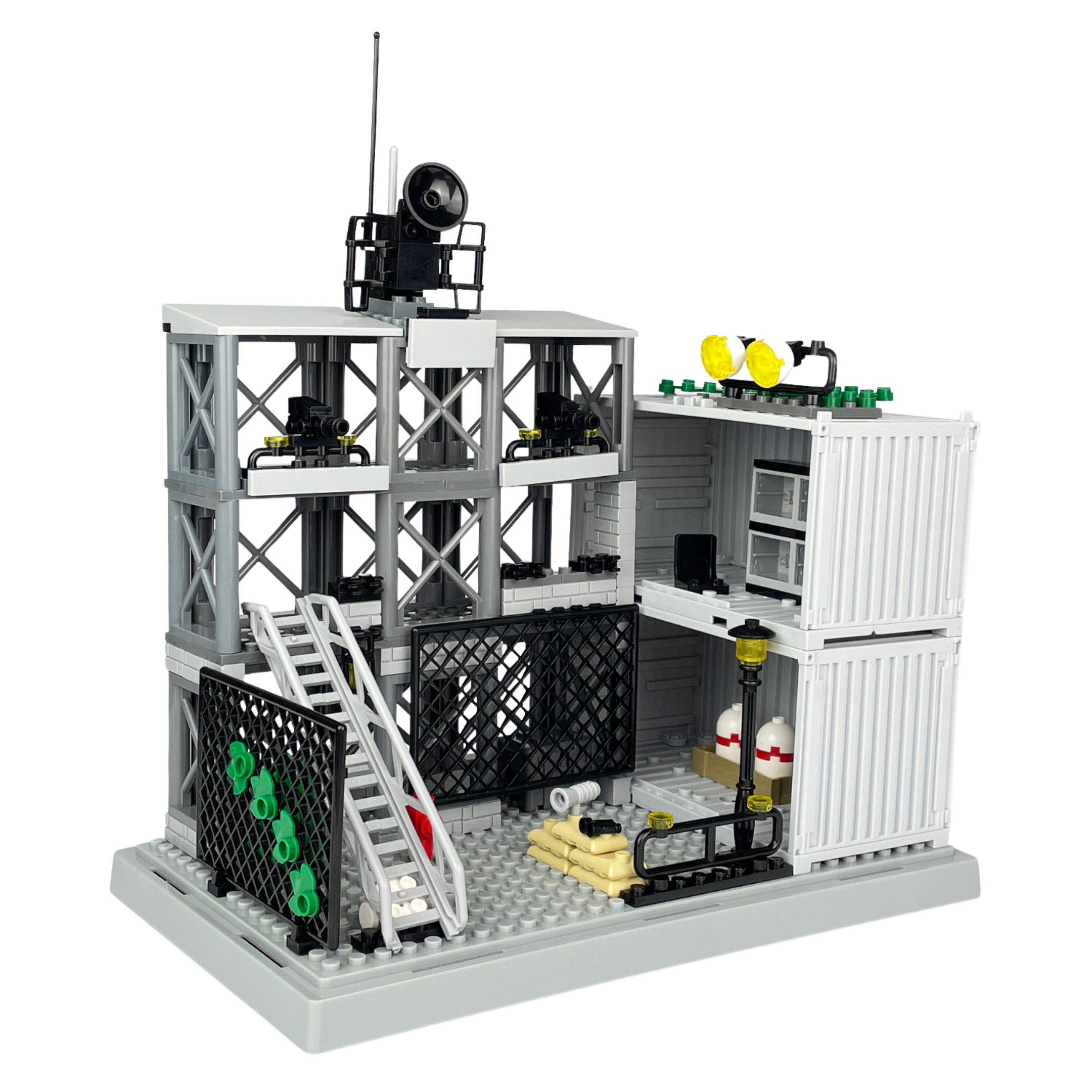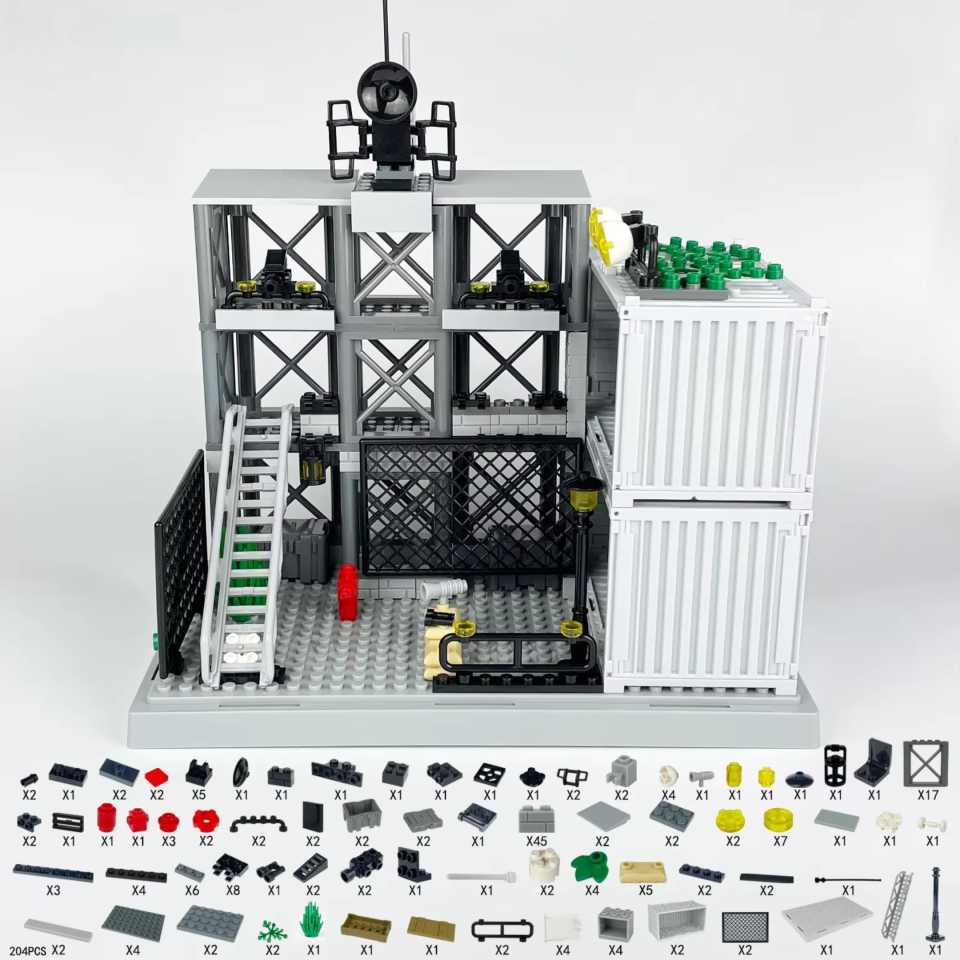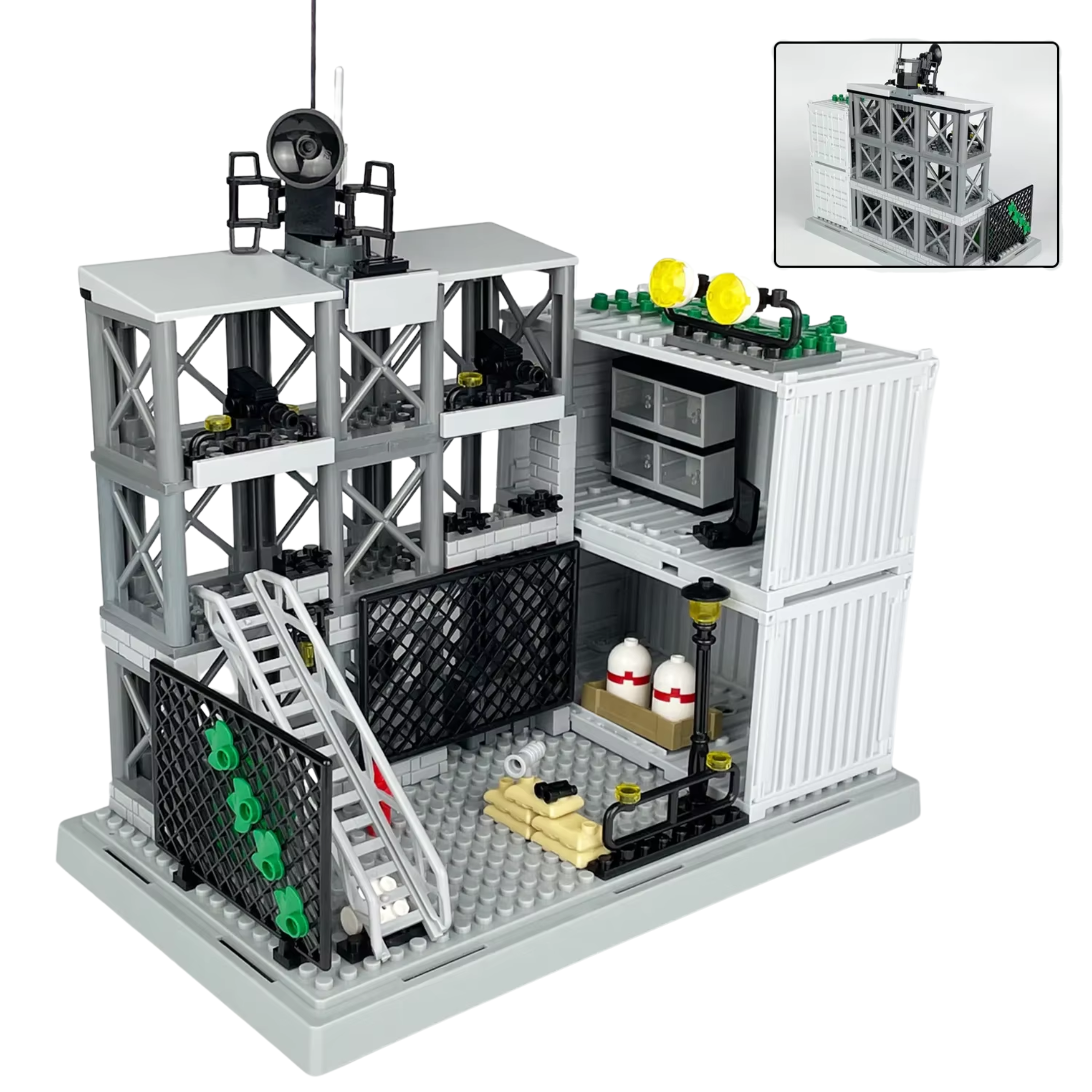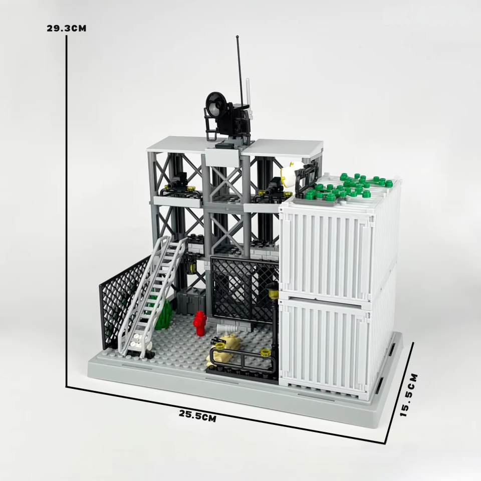 Establish your frontline operations with this detailed modern military compound building blocks set. Featuring a multi-level command tower with mounted machine guns, satellite dish, and reinforced fencing, this base is built for strategic control. Includes storage containers, floodlights, control consoles, ladders, and essential battlefield gear like sandbags and med kits. Ideal for creating realistic military dioramas or expanding your urban warfare scene.