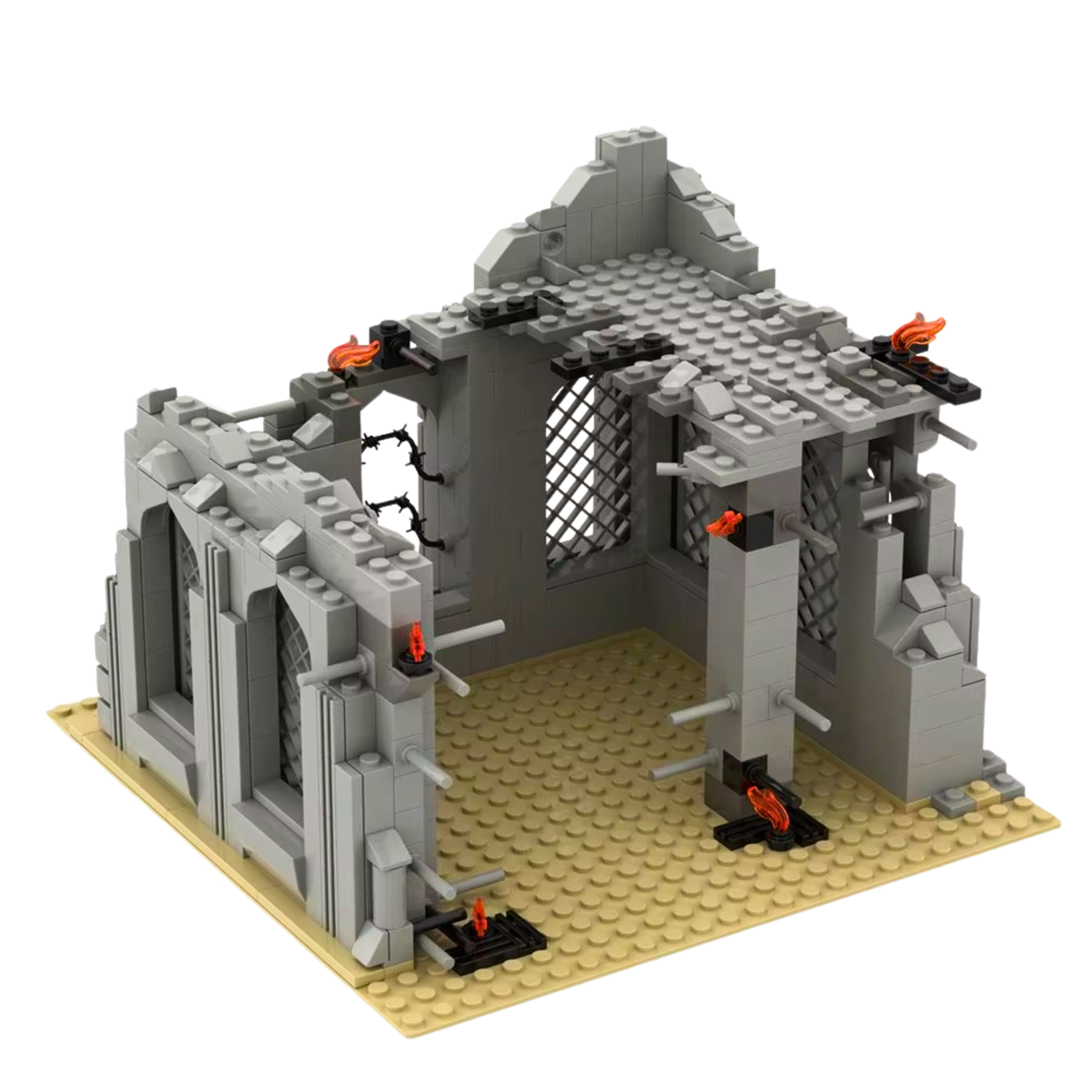 A war-torn cathedral structure, perfect for historical battle dioramas, urban warfare scenes, and post-apocalyptic setups. This detailed ruined cathedral features collapsed walls, fire damage, barbed wire defenses, and gothic architecture, making it a realistic centerpiece for warzone displays, strategic battle environments, and military storytelling.